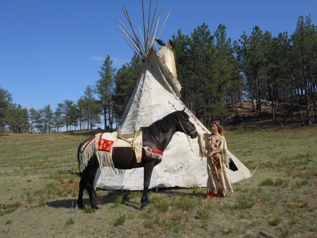 A model horse, complete with porcupine-quilled pad saddle, martingale, crupper and leg cuffs.
